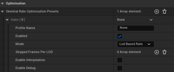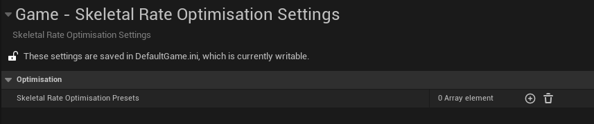To set up optimisation profiles, go to your **project settings** in the **Game** and **Skeletal Rate Optimisation Settings**.&#x20;